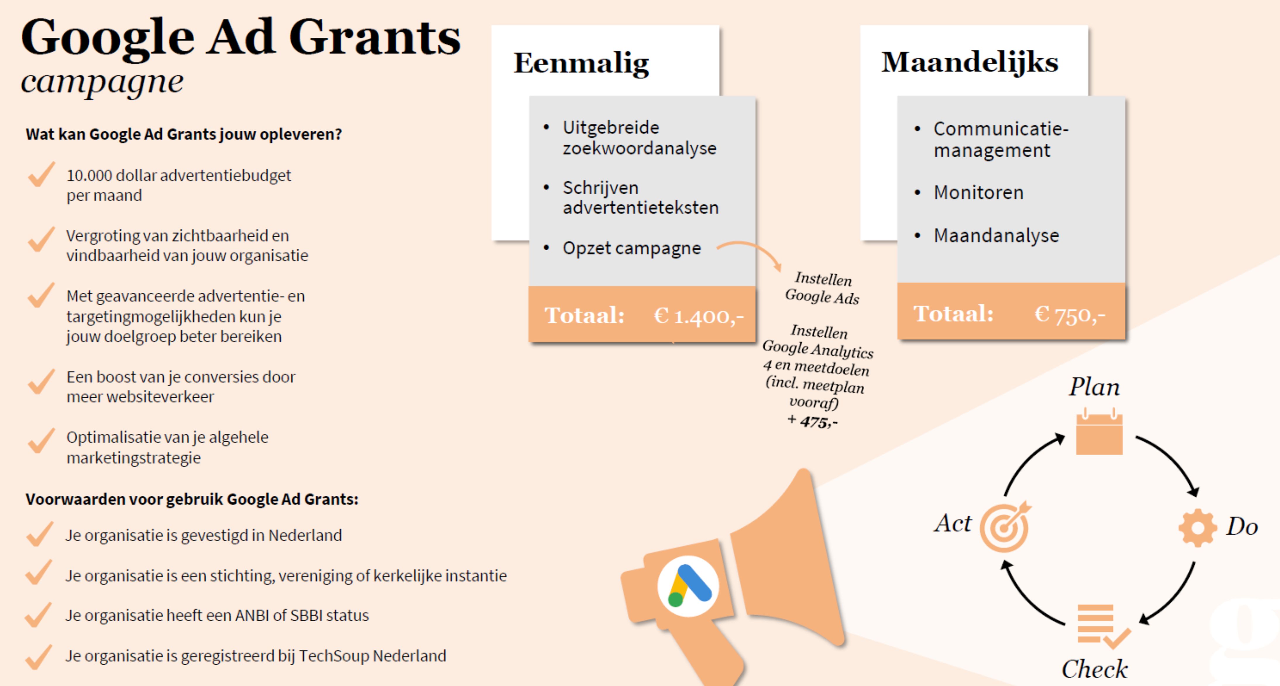 Wil je als non-profit organisatie je inschrijvingen, donaties, merkbekendheid of conversies vergroten? Doe dan een aanvraag voor het Google Ad Grants programma van Google. Google Ad Grants biedt non-profit organisaties namelijk de mogelijkheid om gratis gebruik te maken van Google Ads met een maandelijks advertentiebudget van 10.000 dollar.