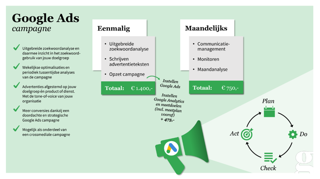 Als Google Partner zijn we gespecialiseerd in het opzetten en optimaliseren van Google Ads campagnes. Zichtbaar zijn in Google is vaak essentieel voor het behalen van jouw marketingdoelen. Samen kijken we naar welk type campagne en welk budget de beste resultaten opleveren.