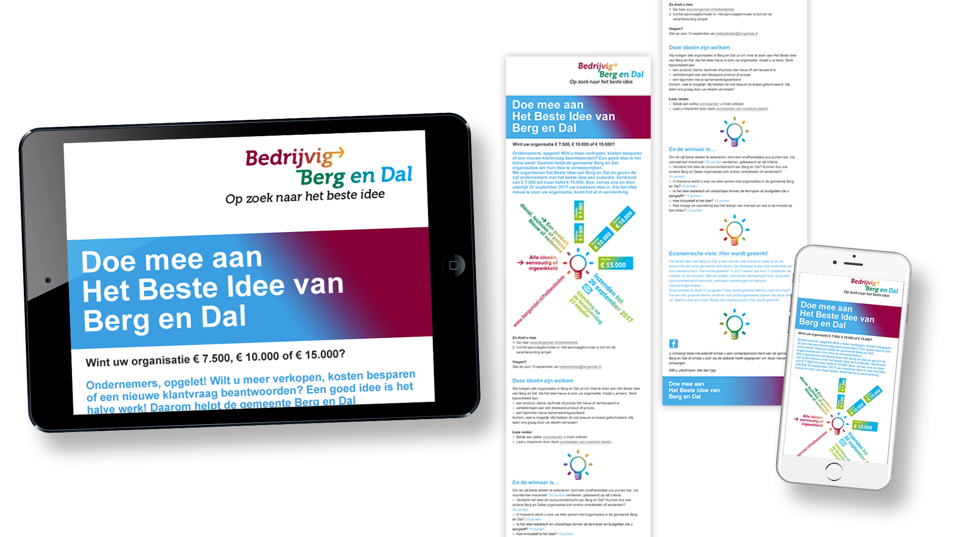 Berg en Dal local council wants to encourage entrepreneurs. Its measures include innovation vouchers, and plots of land for new and growing companies. We developed the campaign and took care of communications resources. The campaign achieved over 200% of the target.