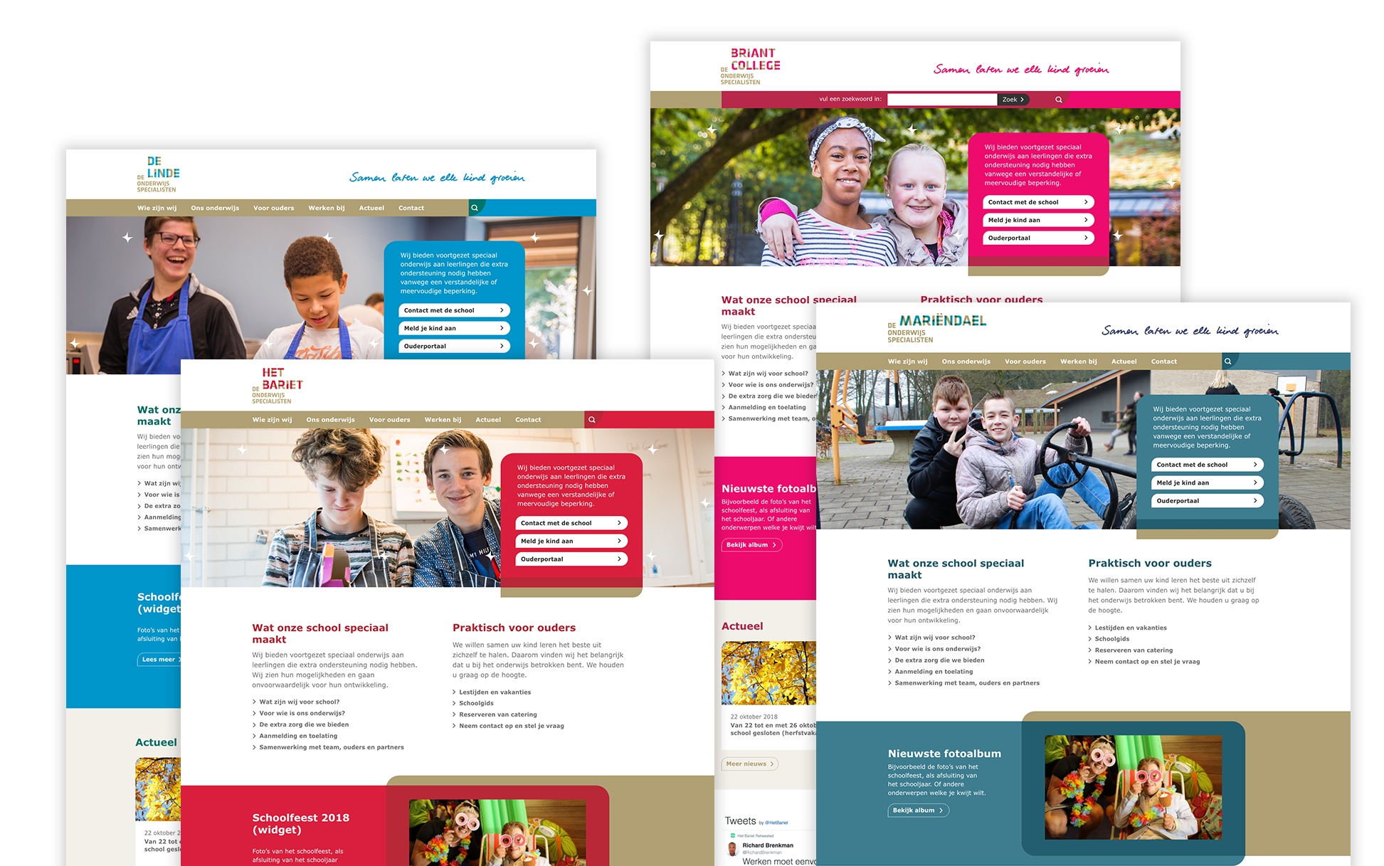 Om alle websites succesvol te lanceren ging ons team van interaction designers, developers en contentspecialisten (tekstschrijver en fotografe) aan de slag. Tijdens een werksessie met De Onderwijsspecialisten specificeerden we de doelen, doelgroepen en contentstructuur van de website. We speelden daarbij in op de redenen die de doelgroepen hebben om de websites te bezoeken en bepaalden daarop ook de conversiemomenten. Na de bouw en goedkeuring van de eerste schoolsite dupliceerden we de complete structuur in het contentmanagementsysteem en realiseerden zo 25 nieuwe schoolsites. Met 25 keer de juiste basistemplates, unieke logo’s en unieke kleurcodes. Ook zijn deze sites uniek wat betreft tekst, maar consistent in tone-of-voice en structuur.