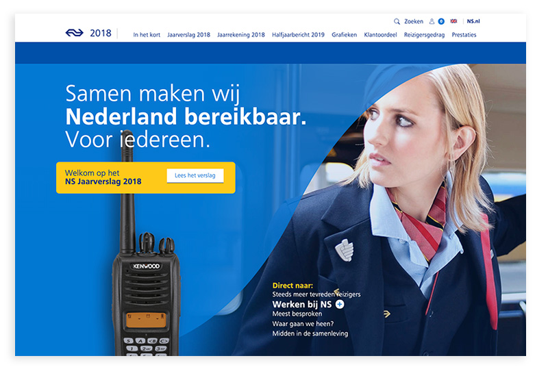 De prestaties van NS op en rond het spoor liggen voortdurend onder een vergrootglas. Het jaarverslag speelt in de communicatie naar stakeholders een centrale rol. Er is de vervoerder alles aan gelegen om open, transparant en realistisch over de eigen activiteiten te rapporteren. Met trots levert Gloedcommunicatie al enkele jaren schrijfcapaciteit voor deze grote klus. We verwerken aangeleverde stukken, stemmen deze intern af en controleren het correctieproces. Ook denken we mee over de structuur en de creatieve schil van de website. Mede dankzij onze inspanningen werden het jaarverslag en de website volgens planning opgeleverd en met veel succes ontvangen.