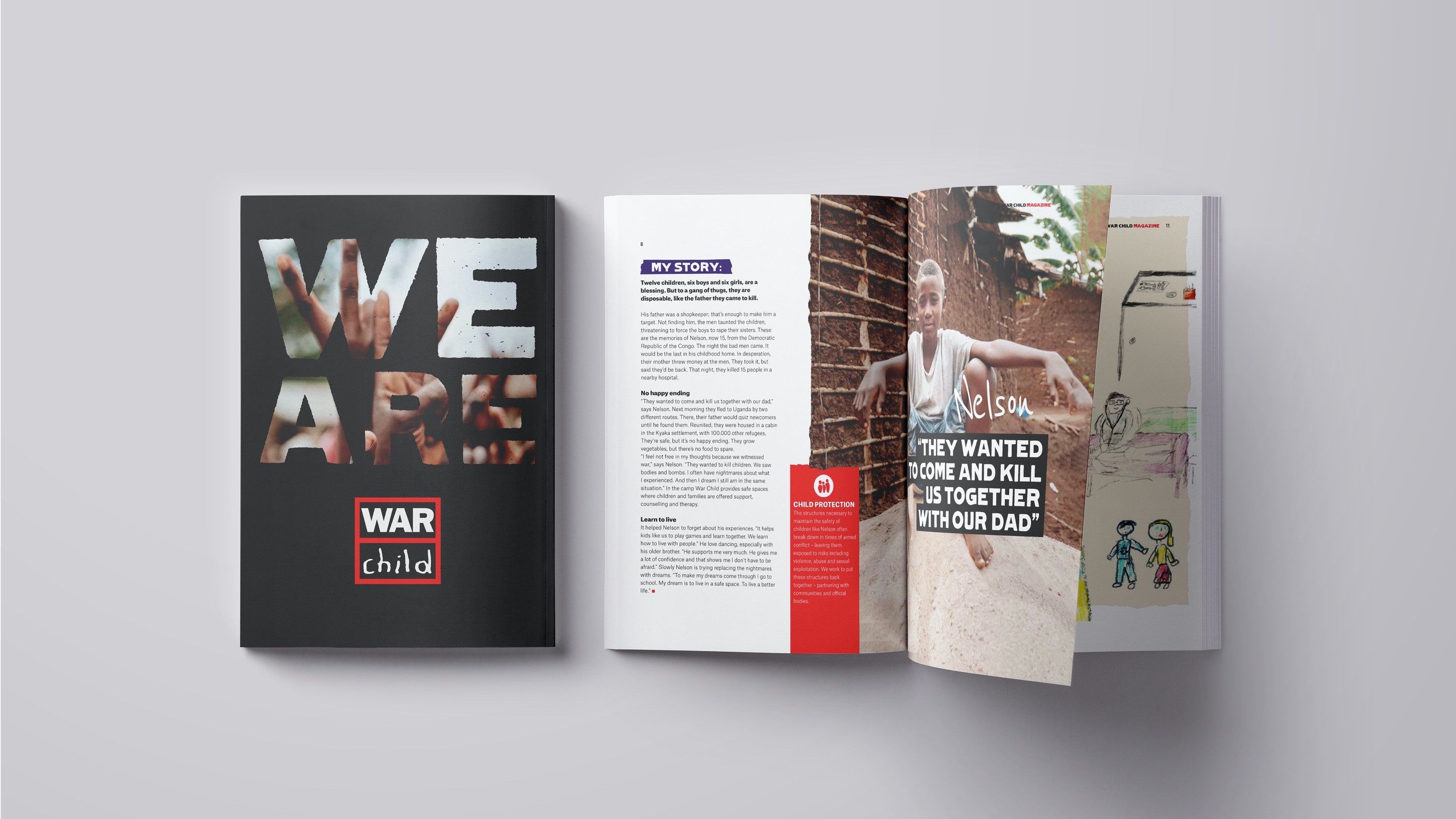 Het jaarverslag wordt daarnaast uitgebracht in de vorm van een poster. Deze poster is dan meteen de omslag voor hun corporate magazine. Dit magazine wordt uitgebracht voor stakeholders over de hele wereld om te laten zien wie War Child is en hoe ze werken. Met verhalen over expertise, impact en resultaten.